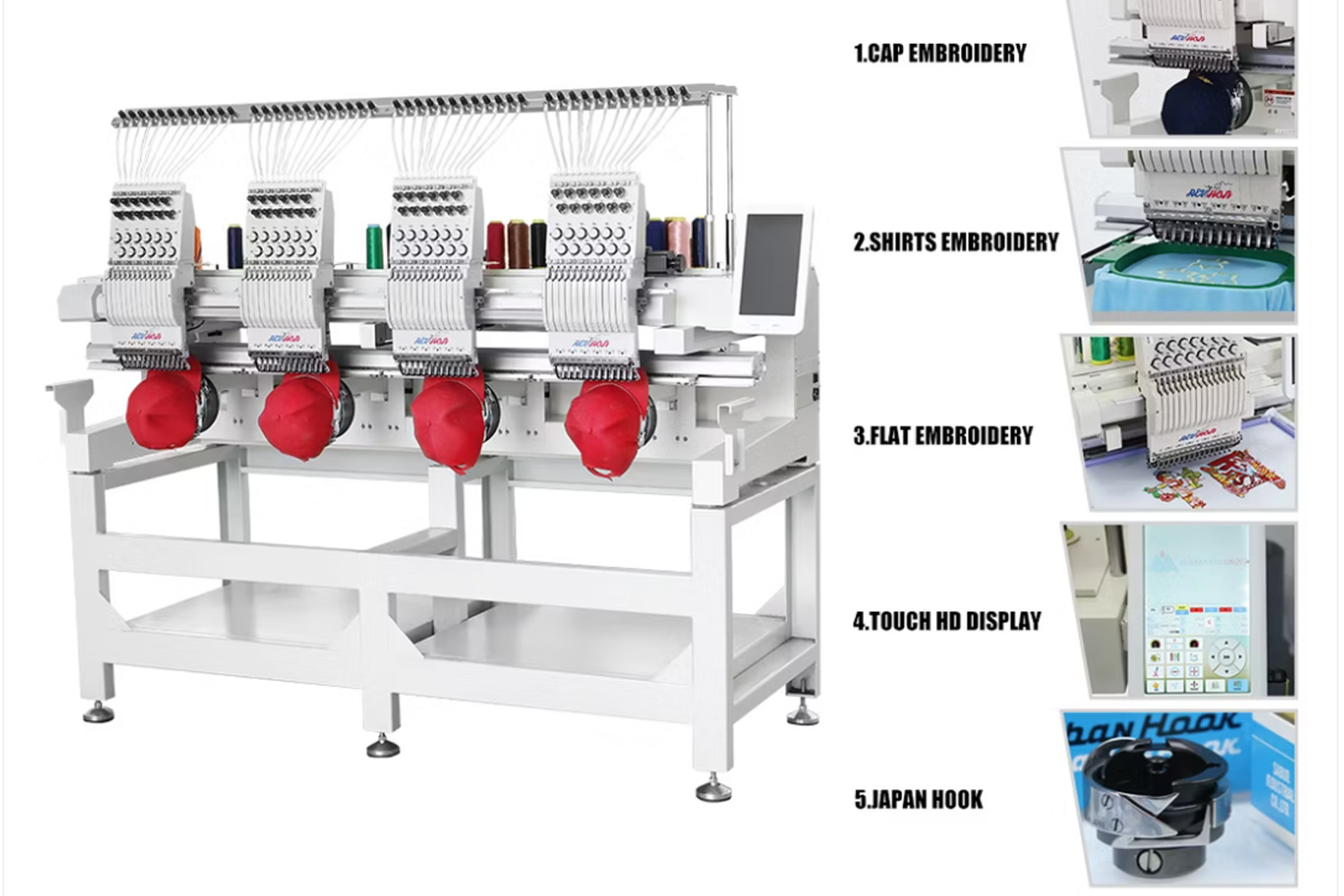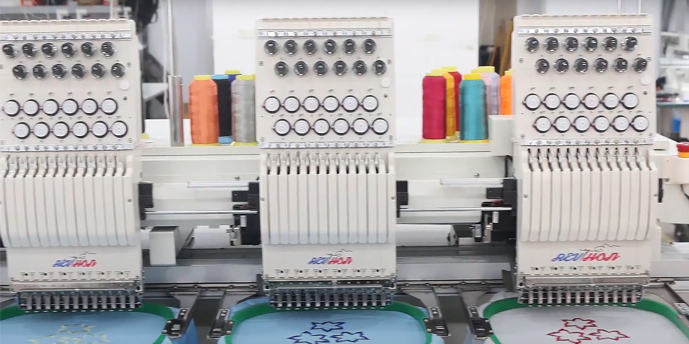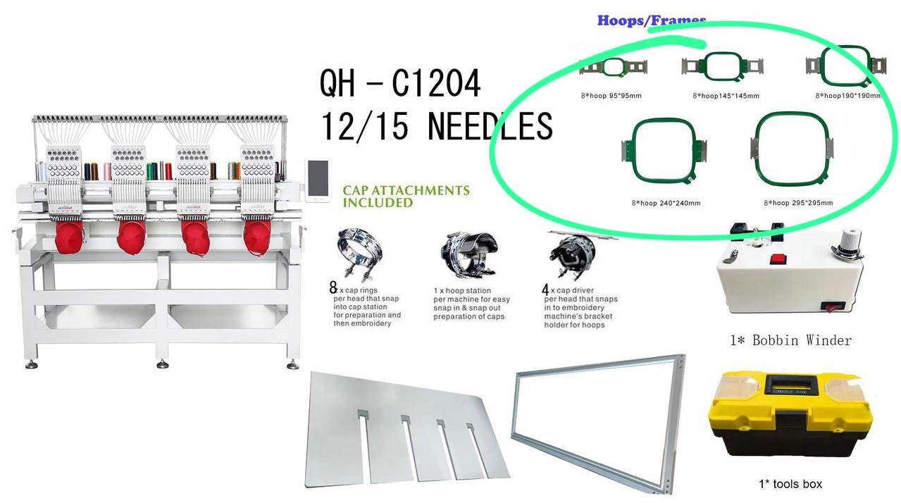 REVHON QH-C1204 - 4-х голова 12-гольна високошвидкісна промислова вишивальна машина з тубулярною платформою. Прекрасний вибір для декорування текстилю, одягу, сумок, головних уборів, створення нашивок і ярликів. Загальне робоче поле цієї моделі становить 1600 х 600 мм. Максимальна швидкість роботи - 1 200 ст/хв. Модель оснащена багатофункціональним 10» сенсорним пультом керування, від провідного виробника електроніки Dahao.